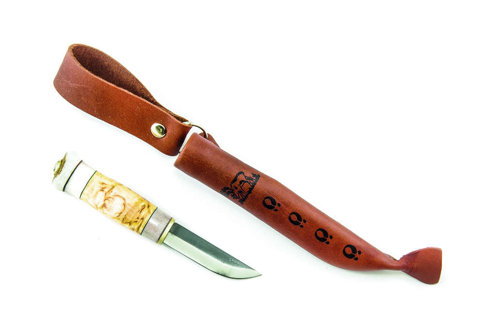 The sheath is made from wet-formed vegetable tanned leather and it has a reindeer leather belt hanger attached to it.