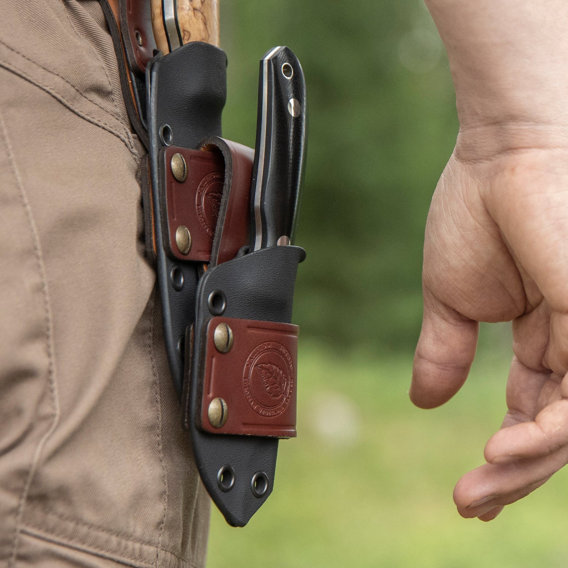 Crafted using ethically sourced, 3 mm thick vegetable-tanned European leather, our leather accessories give you a multitude of choices. Not only can you let your knife hang on the belt the traditional way, but also, for instance, you could “piggy-back” a Safari Mini-Hunter or a folding knife pouch with a No.10 knife. The choice is yours.
